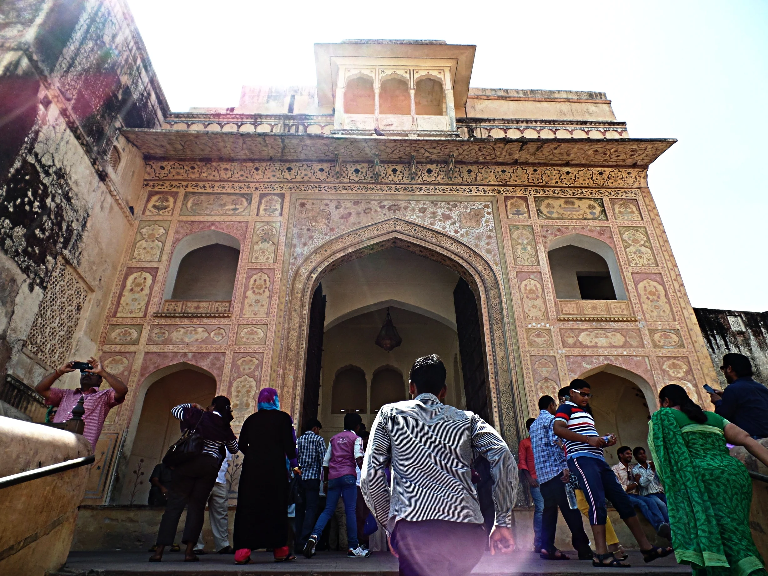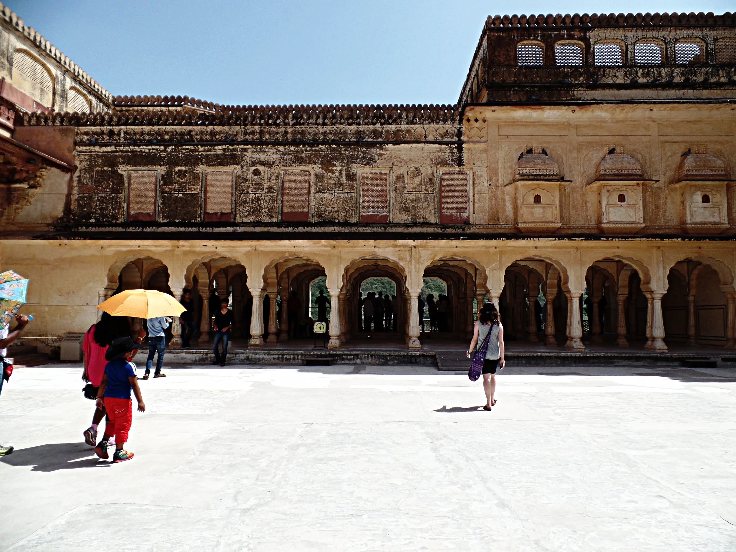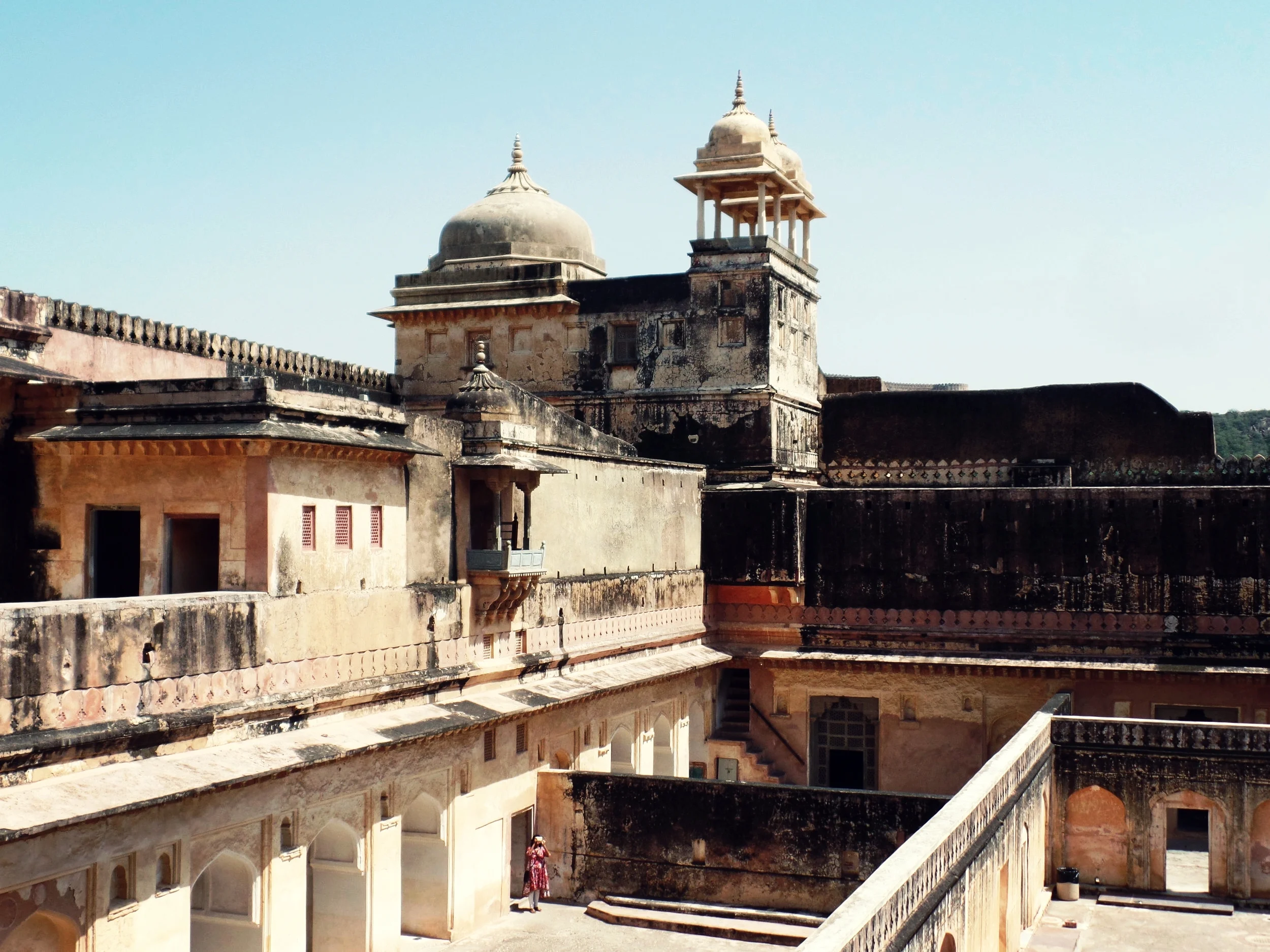 A man runs up the stairs towards the entrance of one of the courtyards in Amer Fort.